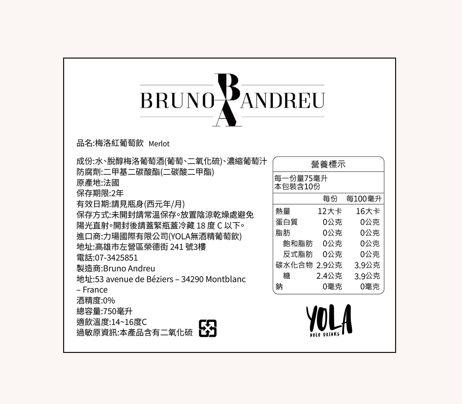 來自法國的BRUNO ANDREU 梅洛紅葡萄飲